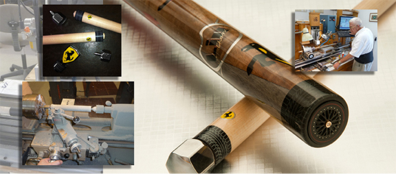 The shavings from the lathe look more like gray snow than wood. Cleanup is a contant part of the process. Cutting the continuous taper of a cue shaft requires a very practiced and patient hand, controlling the cut a precious thousandth at a time.