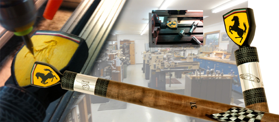 The green, white, and red of the Italian flag set the tone for the Ferrari horse logo, a subtle introduction of color against the bright yellow of the background. In an unusual method of carving, the horse is machined out after the rest of the cap protector is made instead of inlaying it into the yellow dyed English Holly before assembly.