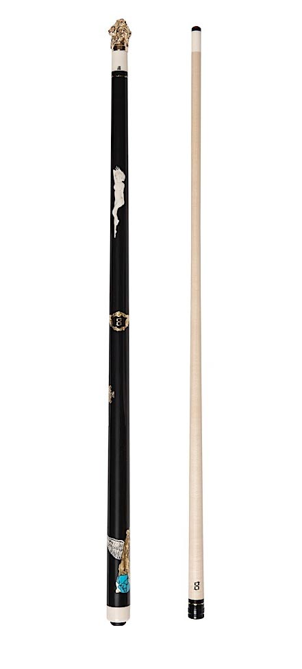 Big Dog The five major inlay icons, in the butt section, were chosen to represent some of the major life happenings for the client and many hours of internet research time were consumed to select the appropriate images he wanted to represent his memories. Even the choice of blue and white diamonds has its own significance. The ebony wood and the many ounces of 18KYG used factored in to the 60” length of the cue and keeping the playing weight and balance was a major obstacle in its construction. The client’s lucky number eight was used several times in the cue, including as an inlay pattern for the collar rings. There is even an inconspicuous engraving in remembrance of how his father signed off on the letters he wrote to him.