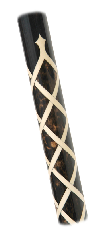 The handle area was perhaps the most difficult accomplishment in the execution of the cue. The stabilized holly is divided into three sections of cross hatching. They are to represent his youth, his adult life and his death down the bottomless pit. The cross-hatching shows the conflicts between good and evil that went on the whole time.