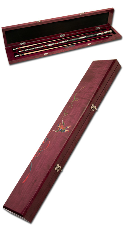 The presentation case for Jester is made from Curly Purple Heart and is inlaid with various recon stones, silver and various colored woods.