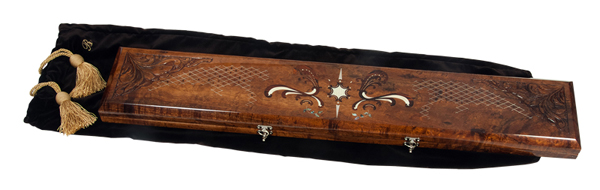 Here are some shots of my "Venetian Dream" wooden presentation case. Made from Burled/Curly/ Koa – the best I’ve seen! Inlaid with sterling silver, Coco Reserve, ivory and then hand carved. There are some 12 coats of finish on the case and velvet lined.